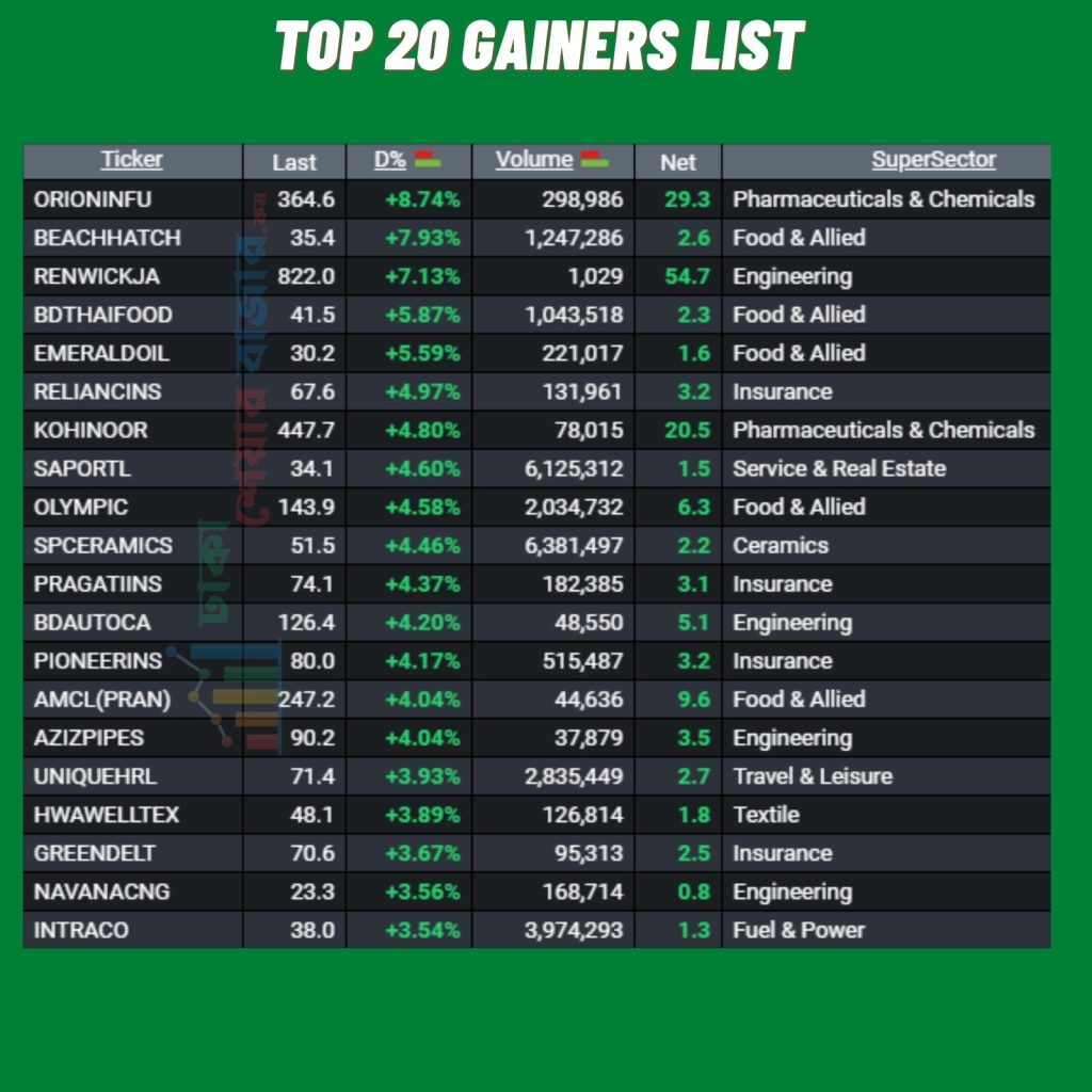 উল্লেখ্য, আজ টপ গেইনিং তালিকাতে বিভিন্ন সময় বিভিন্ন খাতের শেয়ার উঠে এসেছে যা শেষ পর্যন্ত ছিল। আজ দিন শেষে টপ ২০ গেইনিং তালিকাতে  ৮ টি খাতের শেয়ার ছিল।