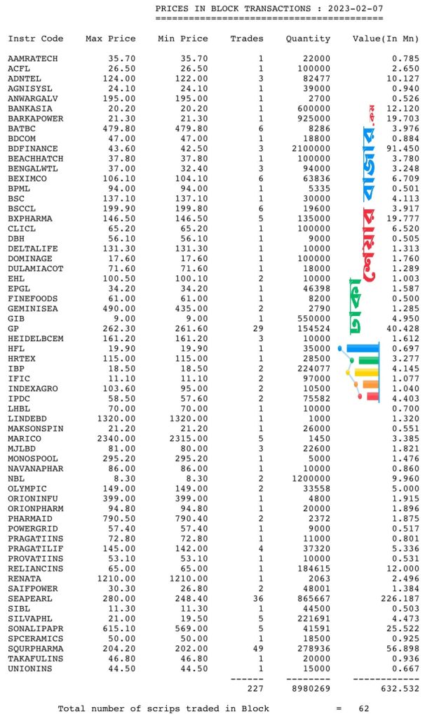 আজ ৭ ফেব্রুয়ারী ২০২৩, দেশের প্রধান পুঁজিবাজার ঢাকা ষ্টক এক্সচেঞ্জে ব্লকে ৬২ টি শেয়ারের মোট লেনদেন হয়েছে ৬৩.২৫ কোটি টাকা। গতকাল ব্লকে মোট ৬৫ টি কোম্পানির ট্রেড হয়েছে ৭৬.৩৭ কোটি টাকা। আজ ব্লকে গত দিনের চেয়ে লেনদেন কম হয়েছে ১৩.১২ কোটি টাকা।
