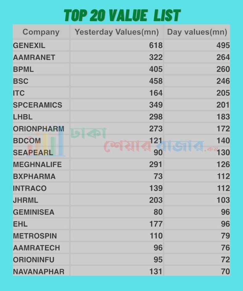 আজকের লেনদেন শীর্ষে ছিল যে সব কোম্পানি নিচে চিত্র আকারে দেয়া হল।