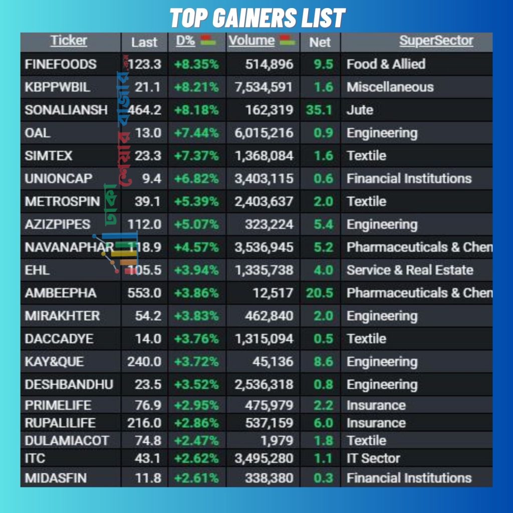 আজ ডিএসইতে দর বৃদ্ধির শীর্ষ তালিকায় উঠে আসা শীর্ষ ২০ তালিকাতে ছিল যে সব কোম্পানি