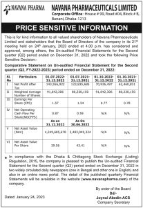 পুঁজিবাজারে তালিকাভুক্ত নাভানা ফার্মাসিউটিক্যালস লিমিটেড (NAVANAFHAR) এর চলতি অর্থবছরের ২য় প্রান্তিকের (অক্টোবর ‘২০২২-ডিসেম্বর’২০২২) ও (জুলাই ‘২০২২-ডিসেম্বর’২০২২) অনিরীক্ষিত আর্থিক প্রতিবেদন প্রকাশ করেছে।