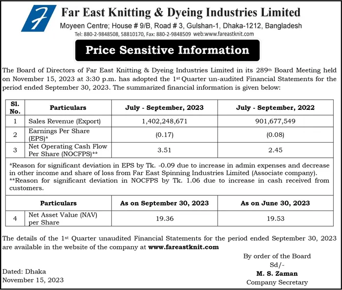 ১৫নভেম্বর , ২০২৩ অনুষ্ঠিত কোম্পানির পরিচালনা পর্ষদের বৈঠকে প্রতিবেদন পর্যালোচনাও অনুমোদনের পর তা প্রকাশ করা হয়।