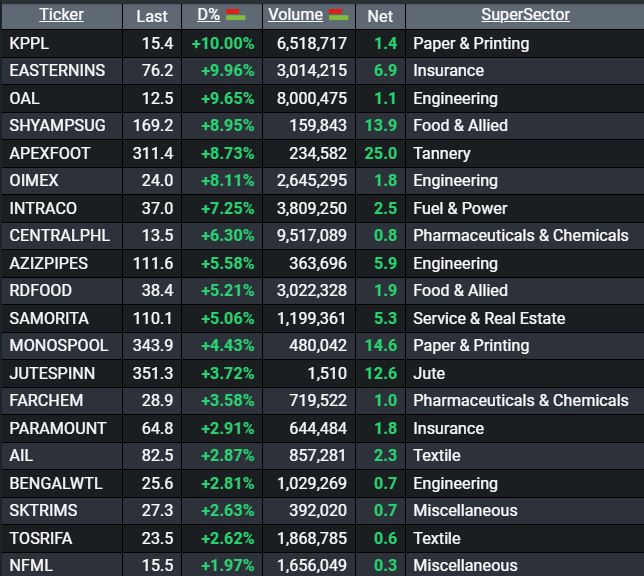 আজ ডিএসইতে দাম বৃদ্ধির শীর্ষে থাকা ২০ টি শেয়ারের তালিকা।