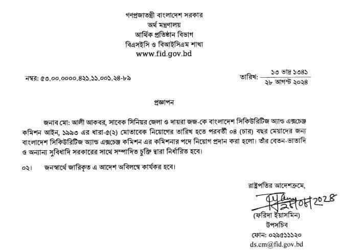 আর্থিক প্রতিষ্ঠান বিভাগের উপসচিব ফরিদা ইয়াসমিন স্বাক্ষরিত প্রজ্ঞাপনে বলা হয়েছে, মো. আলী আকবরকে বাংলাদেশ সিকিউরিটিজ অ্যান্ড এক্সচেঞ্জ কমিশন আইন অনুসারে নিয়োগের তারিখ থেকে পরবর্তী চার বছরের জন্য বিএসইসির কমিশনার পদে নিয়োগ করা হলো। তার বেতন-ভাতা ও অন্যান্য সুবিধাদি সরকারের সঙ্গে সম্পাদিত চুক্তির মাধ্যমে নির্ধারিত হবে।