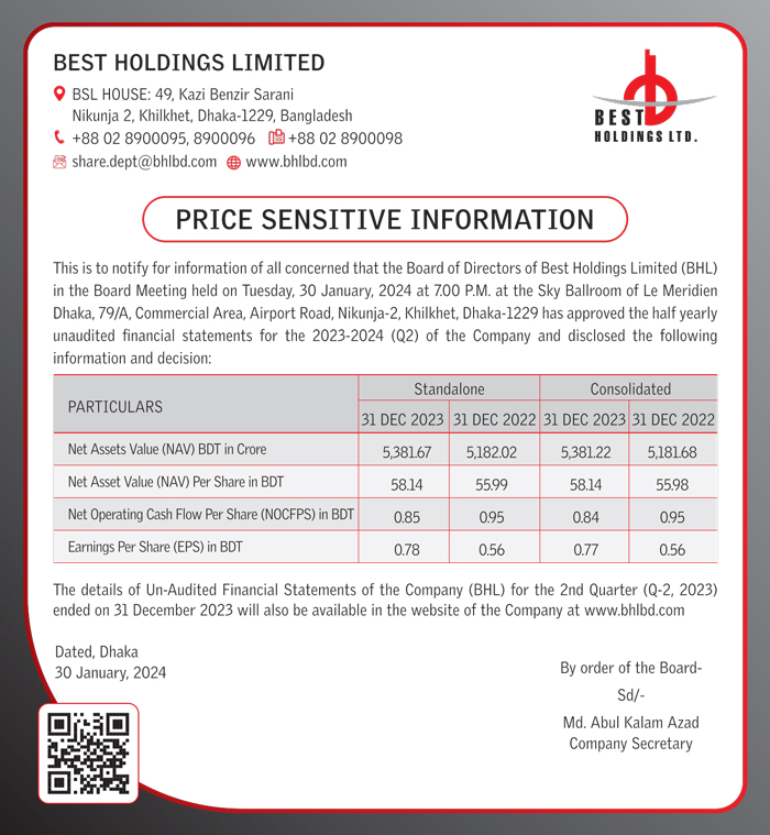 দেশের শেয়ারবাজারে তালিকাভুক্তির প্রক্রিয়ায় থাকা ভ্রমণ ও অবকাশ খাতের কোম্পানি বেস্ট হোল্ডিংস লিমিটেডের (BHL) চলতি অর্থবছরের ২য় প্রান্তিকের (অক্টোবর ২০২৩-ডিসেম্বর ২০২৩) ও (জুলাই ২০২৩-ডিসেম্বর ২০২৩) অনিরীক্ষিত আর্থিক প্রতিবেদন প্রকাশ করেছে।
