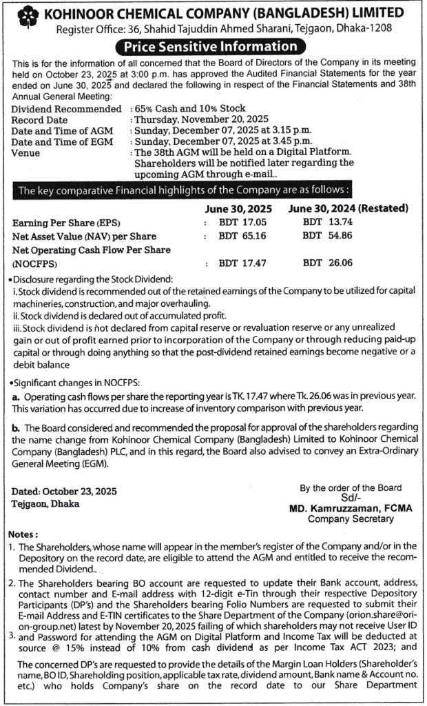 শেয়ারবাজারে তালিকাভুক্ত ওষুধ  রসায়ন খাতের কোম্পানি কোহিনূর কেমিক্যাল লিমিটেডের (KOHINUR) গত ৩০ শে জুন ,২০২৫ তারিখে সমাপ্ত হিসাব বছরের জন্যলভ্যাংশ ঘোষণা করেছে।কোম্পানিটি  আলোচিত বছরের জন্য শেয়ার হোল্ডারদের ৭৫ শতাংশ লভ্যাংশ দিবে। এরমধ্যে ৬৫ শতাংশ নগদ লভ্যাংশ ১০ শতাংশ বোনাস লভ্যাংশ দিয়েছে।