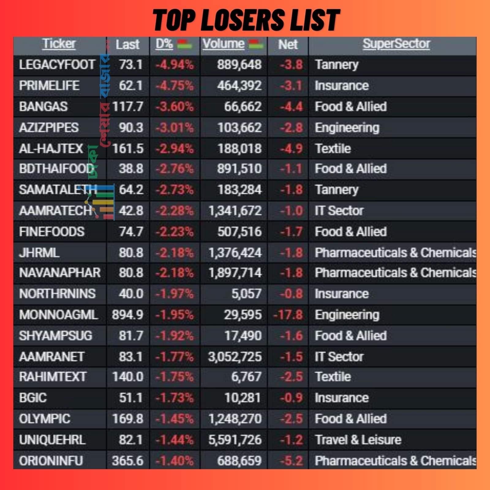 আজ শীর্ষ ২০ দাম কমার শীর্ষ তালিকায় ৮ টি খাতের শেয়ার ছিল।লিগেছি ফুটওয়ার আজ দাম কমার তালিকায় শীর্ষে ছিল।
