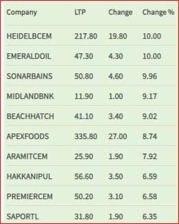 আজ সিএসইতে দাম বৃদ্ধির শীর্ষে থাকা ১০ টি শেয়ার।