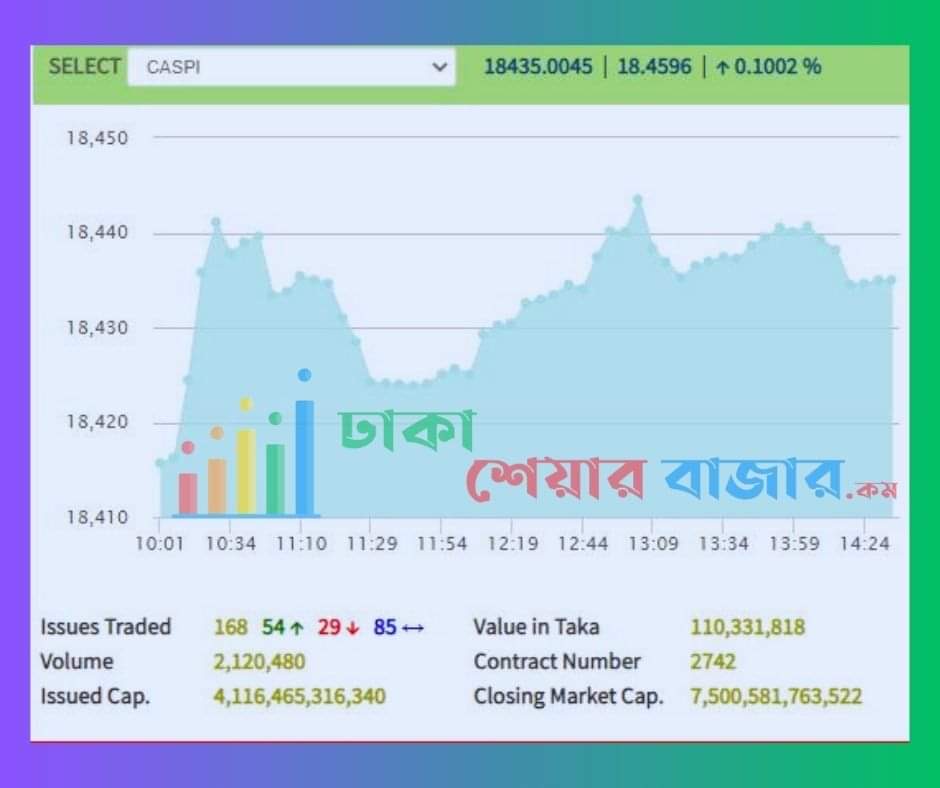 অপরদিকে দেশের ২য় শেয়ার বাজার চট্টগ্রাম স্টক এক্সচেঞ্জের (সিএসই) সূচক ও লেনদেন উভয়ই আজ বেড়ে আজকের লেনদেন শেষ হয়েছে। আজ সিএসই সার্বিক সূচক সিএএসপিআই ২৪.৬৩ পয়েন্ট বেড়ে সূচক অবস্থান করছে ১৮৪৪১.১৮ পয়েন্টে।