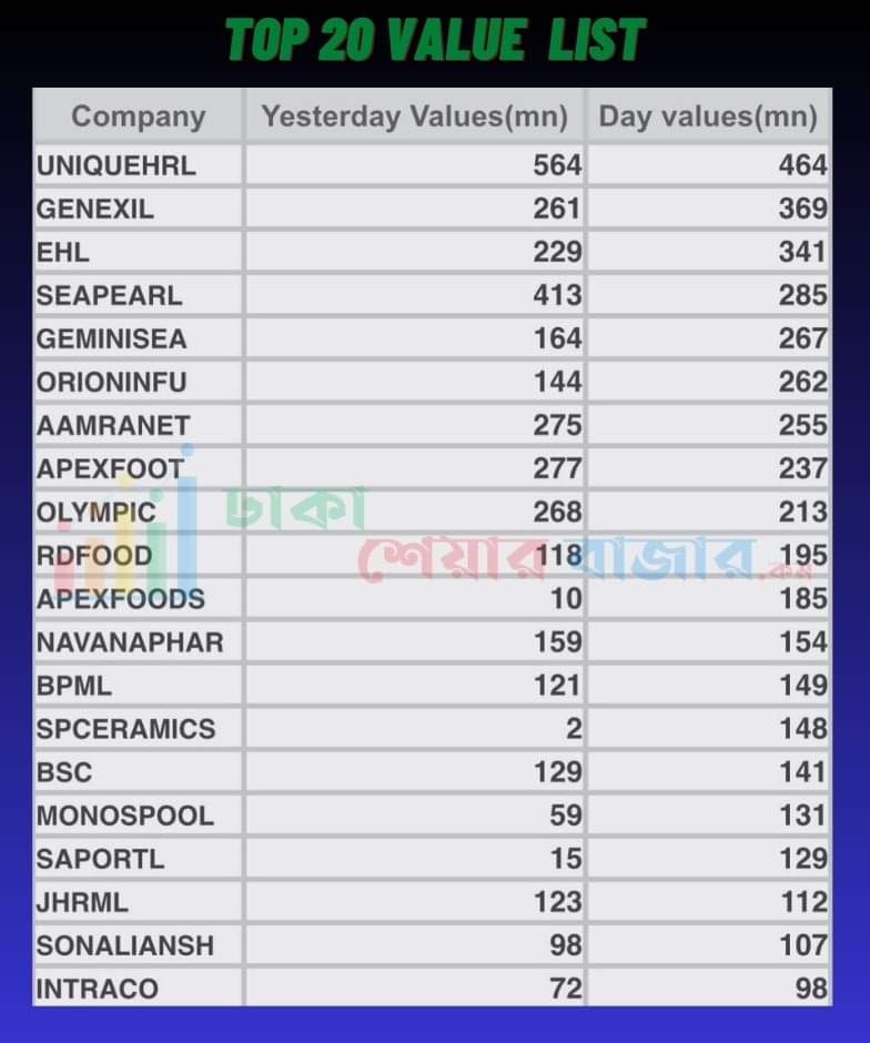 আজ শীর্ষ ২০ (ট্রেড ভ্যালু) লেনদেনের শীর্ষের তালিকায় বিভিন্ন খাতের শেয়ার ছিল। আজ শীর্ষ ২০ (ট্রেড ভ্যালু) লেনদেনের শীর্ষের তালিকায় ছিল ইউনিক হোটেল এন্ড রিসোর্ট পিএলসি। গতকাল ও কোম্পানিটি লেনদেনে প্রথমে ছিল।