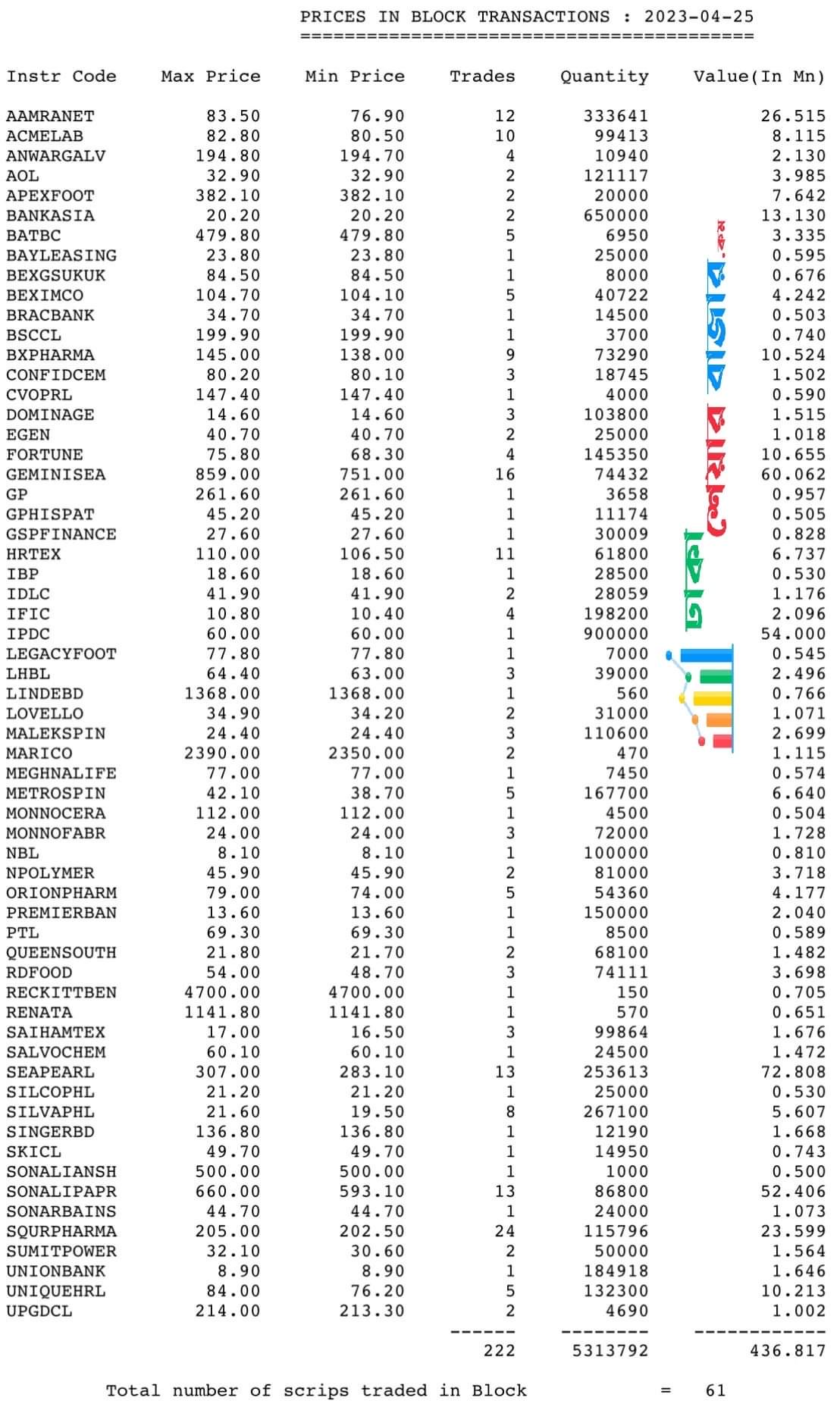 আজ ৬১ টি শেয়ারের ব্লকে মোট লেনদেন হয়েছে ৪৩.৬৮ কোটি টাকা, গতকাল ব্লোকে মোট ৫৫ শেয়ারের ট্রেড হয়েছিল ২৩.৫০ কোটি টাকা। আজ ব্লকে গত দিনের চাইতে ট্রেড বেশি হয়েছে ২০.১৮ কোটি টাকা। সে হিসাবে আজকের মূল মার্কেটের লেনদেন হয়েছে ৬৬৯.৪৭ কোটি টাকা, যা গতকাল ছিল ৫২৯.০২ কোটি টাকা। সে হিসাবে আজ গতকালের চেয়ে মূল মার্কেটে লেনদেন বেশি হয়েছে ১৪০.৪৫ কোটি টাকার।