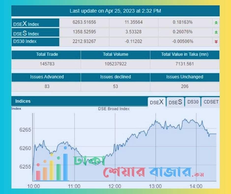 আজ মঙ্গলবার ২৫ এপ্রিল ২০২৩, দেশের প্রধান পুঁজিবাজার ঢাকা স্টক এক্সচেঞ্জের মূল সূচক ও লেনদেন ইতিবাচক ধারাতে শেষ হয়েছে। আজ শুরুতে সূচকের উঠানামা থাকলেও দিনশেষে দারুন ইতিবাচক ধারাতে আজকের লেনদেন শেষ হয়েছে।