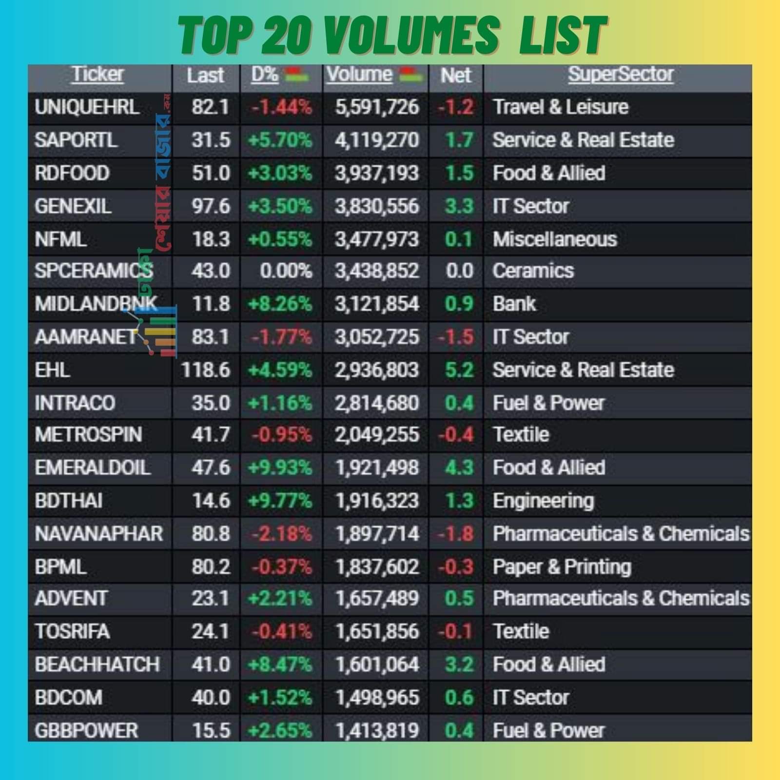 আজ শীর্ষ ২০ (ভলিউম) লেনদেনে শেয়ারের সংখ্যার দিক দিয়ে ১২ টি খাতের শেয়ার ছিল। আজ টপ ২০ শেয়ার সংখ্যার (ভলিউম) দিক দিয়ে প্রথমে ছিল ভ্রমণ ও অবকাশ খাতের কোম্পানি ইউনিক হোটেল এন্ড রিসোর্ট পিএলসি। গতকাল ও কোম্পানিটি ভলিউমে প্রথমে ছিল।