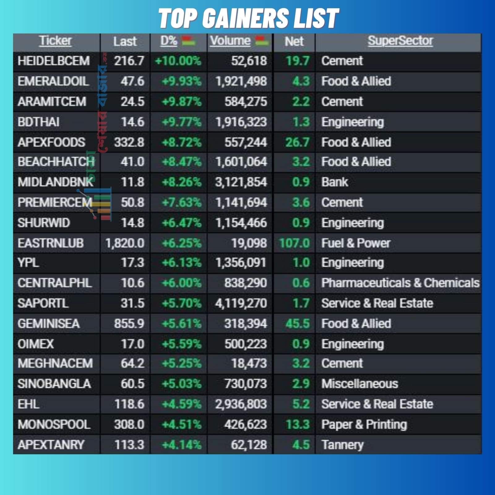 আজ শীর্ষ ২০ দাম বৃদ্ধির শীর্ষ তালিকায় ১০ টি খাতের শেয়ার ছিল। আজ দাম বাড়ার শীর্ষে অনেক দিন পরে সিমেন্ট খাতের ৩ টি শেয়ার উঠে এসেছে। এছাড়া আজ খাদ্য খাতের শেয়ার দাম বৃদ্ধির শীর্ষ তালিকায় আধিপত্য ছিল।আজ দাম বৃদ্ধির শীর্ষ তালিকায় অনেক নতুন শেয়ার চলে এসেছে যা বাজারের জন্যে খুবই ইতিবাচক দিক।