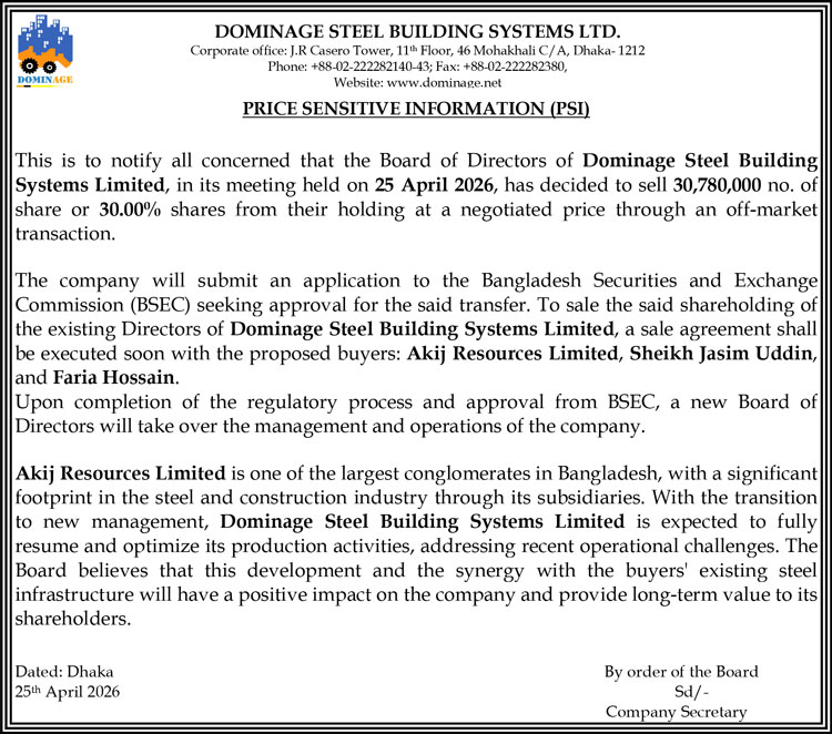 আজ শনিবার (২৫ এপ্রিল ২০২৬) অনুষ্ঠিত ডমিনেজ স্টিলের পরিচালনা পর্ষদের সভায়এই গুরুত্বপূর্ণ সিদ্ধান্ত গ্রহণ করা হয়। কোম্পানি সূত্রে এই তথ্য জানা গেছে।