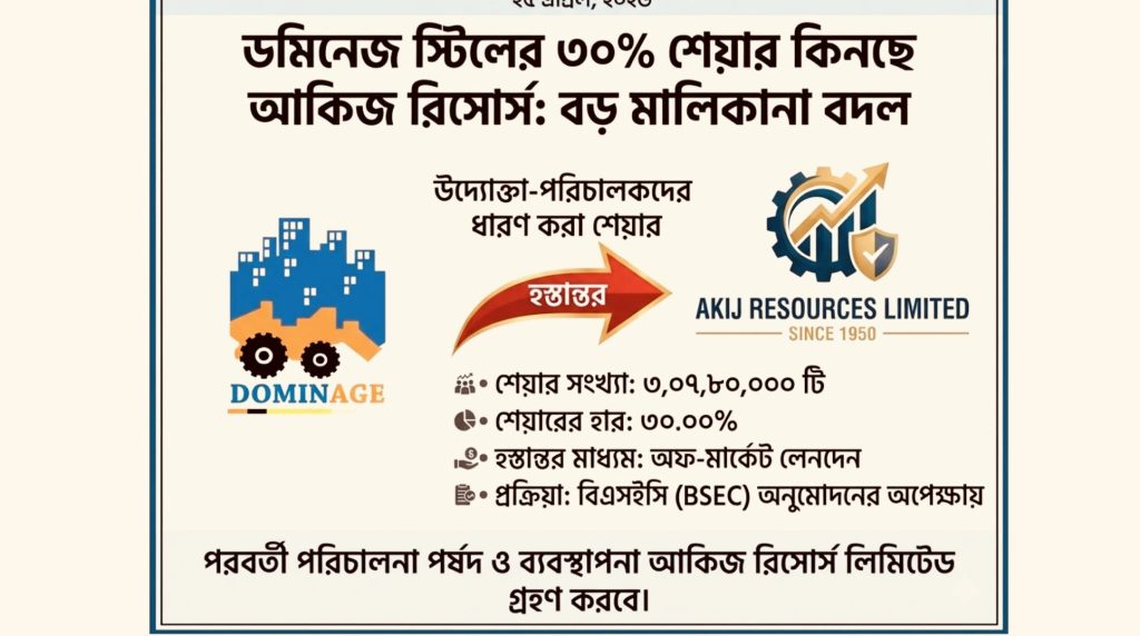 পুঁজিবাজারে তালিকাভুক্ত প্রকৌশল খাতের কোম্পানি ডমিনেজ স্টিল বিল্ডিংসিস্টেমস লিমিটেডের মালিকানায় বড় ধরনের পরিবর্তন আসতে যাচ্ছে। দেশেরঅন্যতম বৃহৎ শিল্পগোষ্ঠী আকিজ রিসোর্স লিমিটেডের কাছে কোম্পানিটিরউদ্যোক্তা–পরিচালকদের ধারণ করা ৩০ শতাংশ শেয়ার বিক্রির সিদ্ধান্ত নেওয়াহয়েছে।