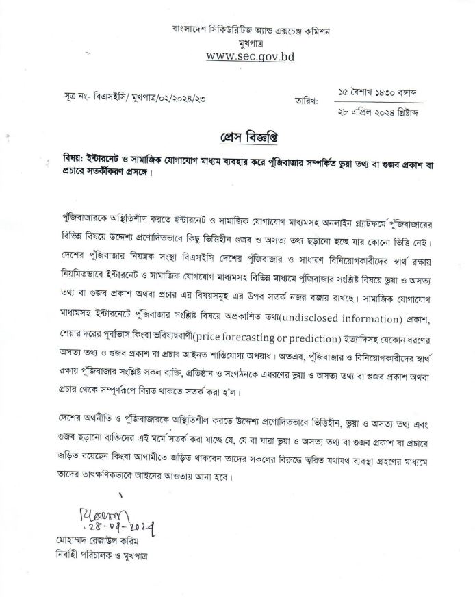 গতকাল রবিবার (২৮শে এপ্রিল) বিএসইসির নির্বাহী পরিচালক ও মুখপাত্র মোহাম্মদ রেজাউল করিম স্বাক্ষরিত এক সংবাদ বিজ্ঞপ্তিতে বলা হয়, শেয়ার বাজারকে অস্থিতিশীল করতে ইন্টারনেট ও সামাজিক যোগাযোগ মাধ্যমসহ অনলাইন প্ল্যাটফর্মে শেয়ারবাজারের বিভিন্ন বিষয়ে উদ্দেশ্য প্রণোদিতভাবে কিছু ভিত্তিহীন গুজব ও অসত্য তথ্য ছড়ানো হচ্ছে যার কোনো ভিত্তি নেই।