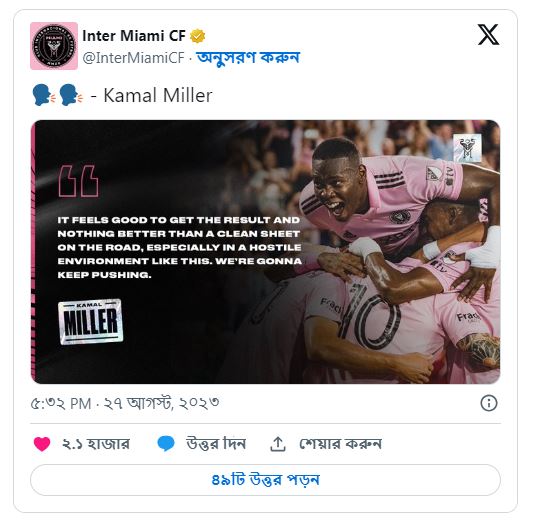 মেসি মায়ামিতে যোগ দেওয়ার পর যে শহরেই খেলতে যাচ্ছেন, সেখানেই অকুণ্ঠ সমর্থন পাচ্ছেন বলে জানিয়েছেন কানাডার হয়ে ৩৮ ম্যাচ খেলা কামাল মিলার, ‘আমরা যত শহরে গিয়েছি, তার মধ্যে নিউইয়র্কে সমর্থন পেয়েছি সবচেয়ে বেশি। বিশেষ করে মেসির জন্য। এটা অনেকটাই পরাবাস্তবের মতো। এই বিশ্বে সেই একমাত্র মানুষ যে এমন সম্মানের যোগ্য।’