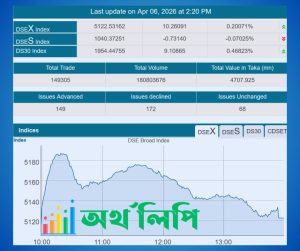 আজ সোমবার (৬ এপ্রিল) দেশের প্রধান শেয়ারবাজার ঢাকা স্টক এক্সচেঞ্জে (ডিএসই) লেনদেনে সূচকের আংশিক ঘুরে দাঁড়ানোর ইঙ্গিত মিললেও সার্বিক বাজার চিত্রে ছিল স্পষ্ট নিস্তেজতা। ভূরাজনৈতিক উত্তেজনা ঘিরে বিনিয়োগকারীদের সতর্ক অবস্থানের কারণে লেনদেনে গতি ফিরে আসেনি।