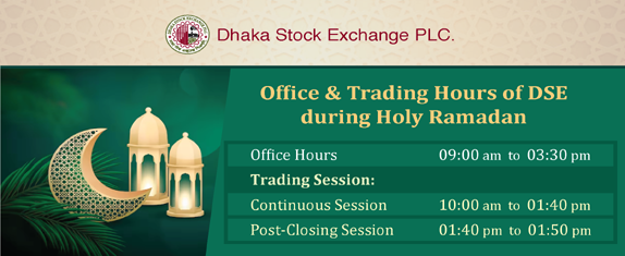 তথ্য  অনুযায়ী , রমজানে ডিএসই মূল লেনদেন হবে সকাল সাড়ে ১০টা থেকে দুপুর ১.৪০ মিনিট পর্যন্ত। দুপুর ১ টা ৪০ মিনিট থেকে ১ টা ৫০ মিনিট লেনদেনের পোস্ট ক্লোজিং নির্ধারিত হয়েছে।