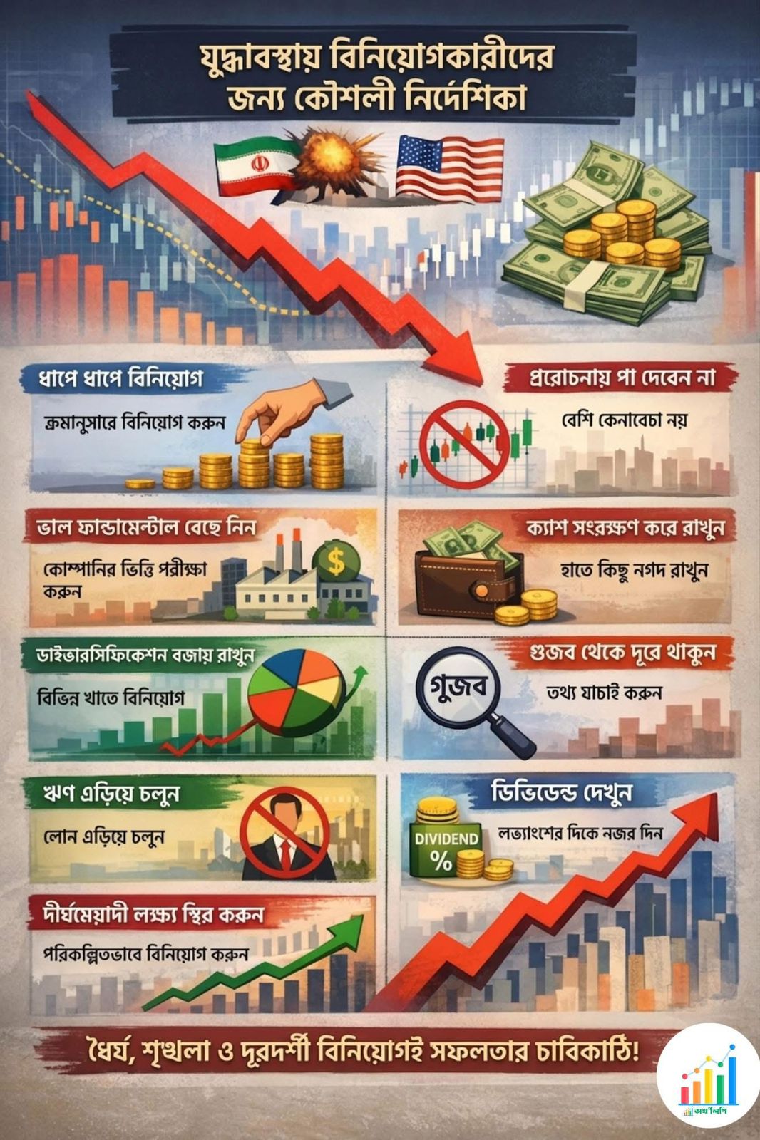 বর্তমান সময়ে বাংলাদেশে পুঁজিবাজারে অনিশ্চয়তা বৃদ্ধি পেয়েছে। ইরান–যুক্তরাষ্ট্রসহ আন্তর্জাতিক ভূরাজনৈতিক উত্তেজনা এবং দেশের অর্থনীতির নানান চ্যালেঞ্জ বিনিয়োগকারীদের জন্য স্বাভাবিক উদ্বেগের কারণ। এই ধরনের পরিস্থিতিতে বিনিয়োগকারীদের মূল লক্ষ্য হওয়া উচিত ধৈর্য, শৃঙ্খলা এবং ঝুঁকি নিয়ন্ত্রণ।