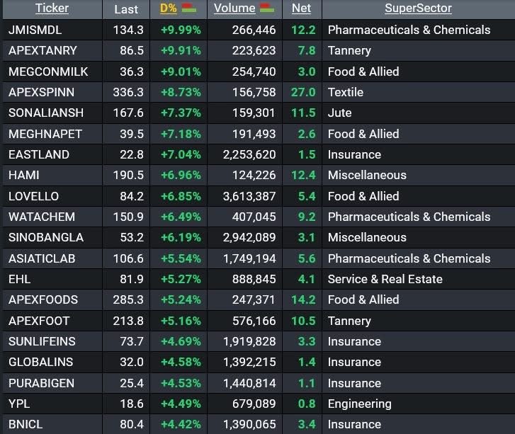 . JMISMDL: +.৯৯% (Pharma) . APEXTANRY: +.৯১% (Tannery) . MEGCONMILK: +.০১% (Food & Allied) . APEXSPINN: +.৭৩% (Textile) . SONALIANSH: +.৩৭% (Jute)