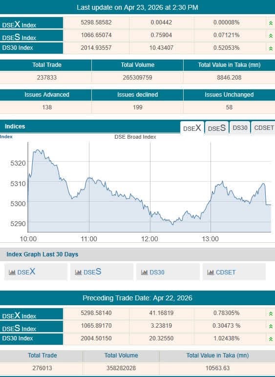 আজ লেনদেন শেষে ডিএসইর প্রধান সূচক DSEX মাত্র .০০৪৪২ পয়েন্ট  বেড়েঅবস্থান করছে ৫২৯৮.৫৮ পয়েন্টে। শরীয়াহ ভিত্তিক সূচক DSES .৭৫ পয়েন্ট বেড়ে১০৬৬.৬৫ পয়েন্টে দাঁড়িয়েছে। তবে ব্লুচিপ সূচক DS30 তুলনামূলক ভালো অবস্থানেছিল, যা ১০.৪৩ পয়েন্ট বেড়ে ২০১৪.৯৩ পয়েন্টে দিন শেষ করেছে।