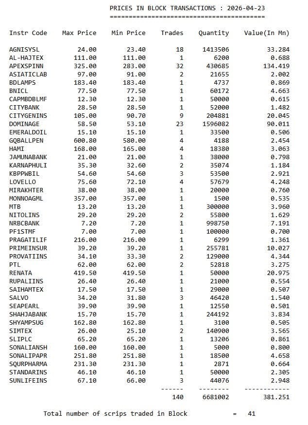 আজ ব্লক মার্কেটে মোট ৪১টি স্ক্রিপ্টের লেনদেন হয়েছে। সেখানে ১৪০টি ট্রেডেরমাধ্যমে মোট ৩৮১.২৫১ মিলিয়ন (৩৮.১২ কোটি) টাকার শেয়ার লেনদেন হয়েছে। ব্লকমার্কেটে সবচেয়ে বেশি লেনদেন হতে দেখা গেছে APEXSPINN এবং DOMINAGEএর শেয়ার।