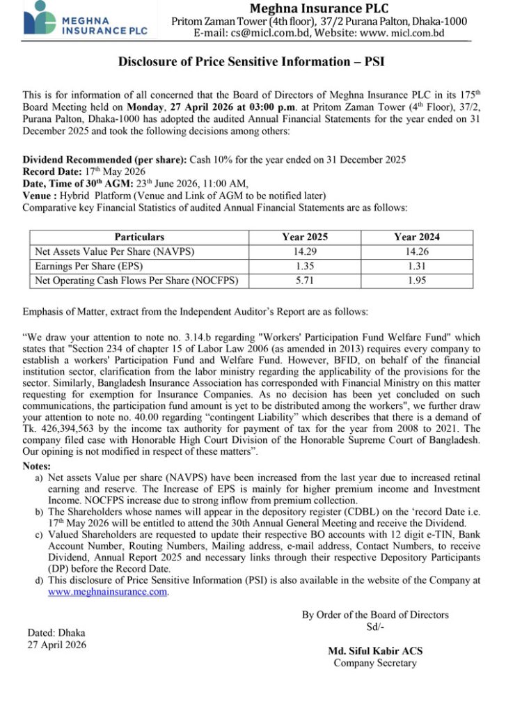 এক নজরে লভ্যাংশ ও সভার তথ্য:ঘোষিত লভ্যাংশ: ১০ শতাংশ নগদ (২০২৫ সালের জন্য)।রেকর্ড ডেট: ১৭ মে ২০২৬।বার্ষিক সাধারণ সভা (এজিএম): ২৩ জুন ২০২৬, বেলা ১১টা।এজিএম-এর স্থান: হাইব্রিড প্ল্যাটফর্ম (পরে বিস্তারিত জানানো হবে)।