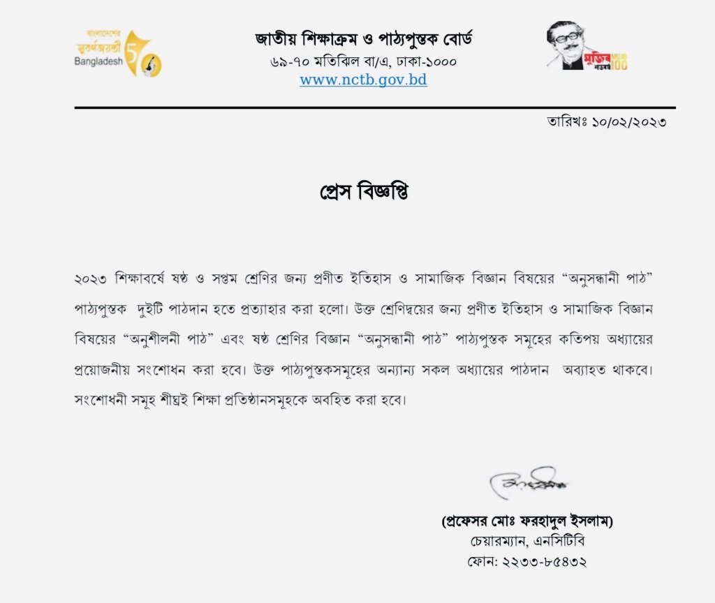 আজ শুক্রবার ১০ ফেব্রুয়ারি২০২৩, জাতীয় শিক্ষাক্রম ও পাঠ্যপুস্তক বোর্ড এ সংক্রান্ত একটি বিজ্ঞপ্তি প্রকাশ করেছে। এতে সই করেছেন বোর্ডের চেয়ারম্যান প্রফেসর মো. ফরহাদুল ইসলাম।