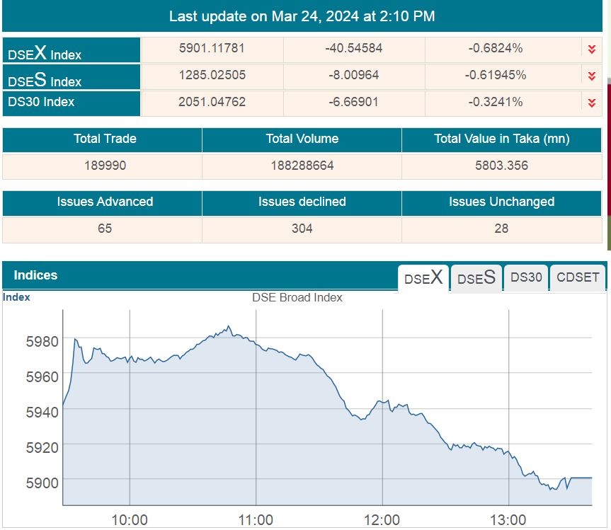 আজ ডিএসইর প্রধান সূচক ‘ডিএসইএক্স ৪০.৫৪ পয়েন্ট কমে ৫৯০১.১১ পয়েন্টে এসেছে।এছাড়াও, শরীয়াহ সূচক ‘ডিএসইএস’ ৮ পয়েন্ট কমেছে। দিন শেষে সূচকটির অবস্থান ছিল ১২৮৫.০২ পয়েন্টে। অন্যদিকে ডিএসই-৩০ সূচক ০৬.৬৬ পয়েন্ট কমে ২০৫১.০৪ পয়েন্টে দাঁড়িয়েছে।