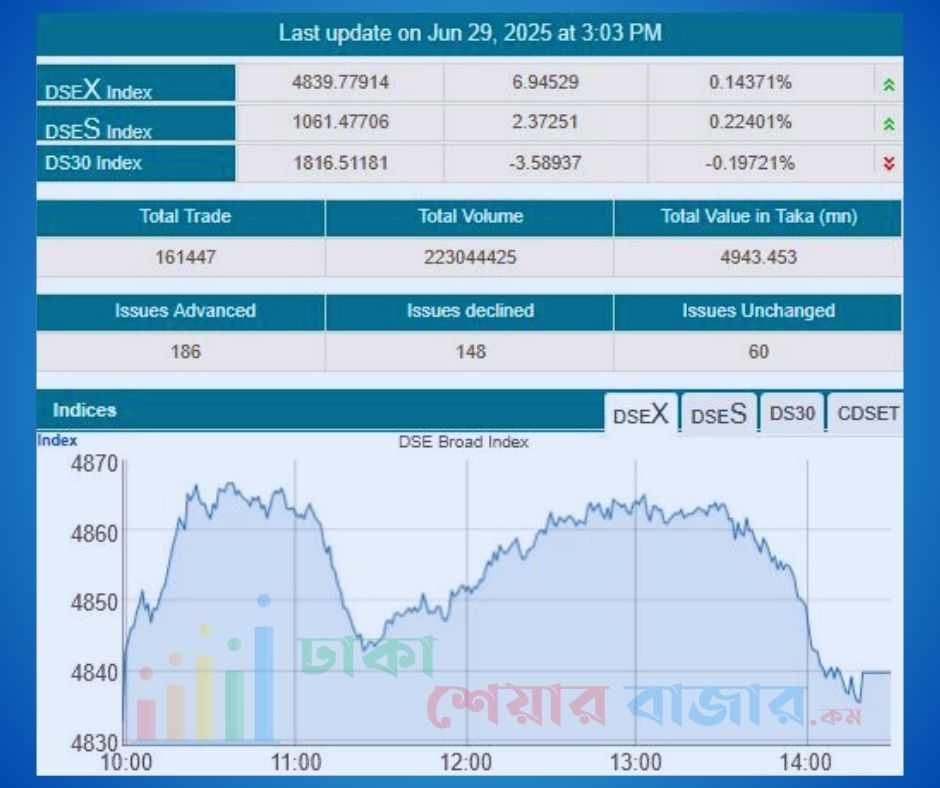আজকের বাজার বিশ্লেষণে দেখা যায়, ডিএসই প্রধান বা ডিএসইএক্স সূচক ৬.৯৪ পয়েন্ট বেড়ে অবস্থান করছে ৪৮৩৯.৭৭ পয়েন্টে। অন্য সূচকগুলোর মধ্যে ডিএসইএস বা শরীয়াহ সূচক ২.৩৭ পয়েন্ট বেড়ে অবস্থান করছে ১০৬১.৪৭ পয়েন্টে এবং ডিএস৩০ সূচক ৩০ পয়েন্ট কমে দাঁড়িয়েছে ১৮১৬.৫১ পয়েন্টে।