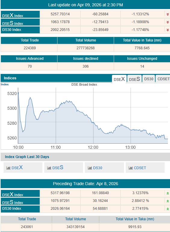 আজ বৃহস্পতিবার (৯ এপ্রিল)সপ্তাহের শেষ কার্যদিবসে ঢাকা স্টক এক্সচেঞ্জে দেখা গেছে স্পষ্ট নেতিবাচক প্রবণতা। দিনের শুরুতে কিছুটা স্থিতিশীলতা থাকলেও সময় গড়ানোর সাথে সাথে বিক্রির চাপ বাড়তে থাকে, যা শেষ পর্যন্ত সূচকের পতনে প্রতিফলিত হয়েছে।