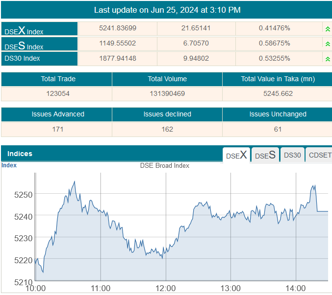 আজ মঙ্গলবার (২৫ জুন) সপ্তাহের তৃতীয় কার্যদিবস দেশের প্রধান পুঁজিবাজার ঢাকা স্টক এক্সচেঞ্জে (ডিএসই) মূল্যসূচক ইতিবাচকভাবে লেনদেন শেষ হয়েছে। পাশাপাশি আগের কার্যদিবসের তুলনায় বেড়েছে লেনদেন। বেড়েছে বেশিরভাগ কোম্পানির শেয়ারের দর।