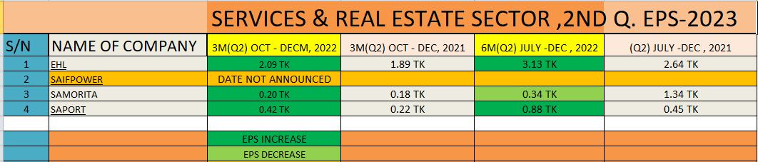 পুঁজিবাজারে তালিকাভুক্ত সেবা ও আবাসন খাতে মোট ৪ টি কোম্পানি আছে।৪ টি কোম্পানির মধ্যে ইতিমধ্যে ৩ টির ২য় প্রান্তিক ইপিএস ঘোষণা করেছে।