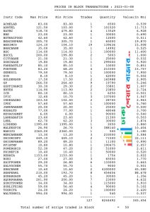 আজ রবিবার, ৮ জানুয়ারী ২০২৩, দেশের প্রধান শেয়ার বাজার ঢাকা স্টক এক্সচেঞ্জে ব্লকে ৫০ টি শেয়ারের মোট লেনদেন হয়েছে ৩৪.৫৪ কোটি টাকা।