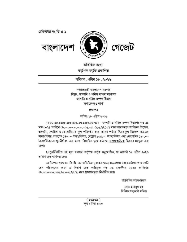 সর্বশেষ ১ ফেব্রুয়ারি ২০২৬-এ নির্ধারিত দামের তুলনায় এবার সব ধরনের জ্বালানিতে উল্লেখযোগ্য বৃদ্ধি এসেছে। নতুন দামে—