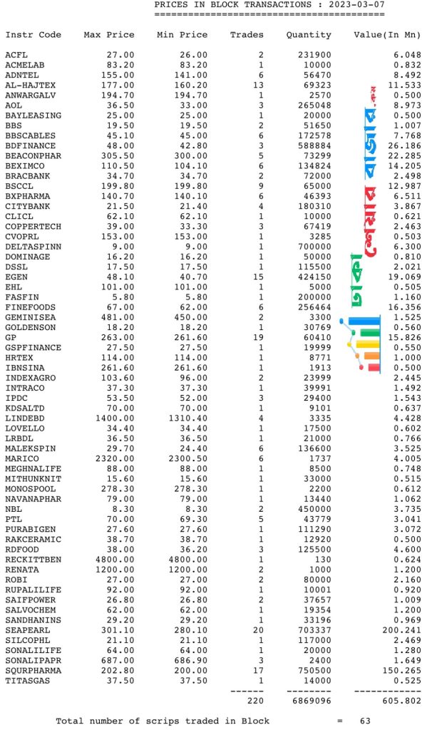 আজ ৭ই মার্চ ২০২৩, দেশের প্রধান পুঁজিবাজার ঢাকা ষ্টক এক্সচেঞ্জে ব্লকে ৬৩ টি শেয়ারের মোট লেনদেন হয়েছে ৬০.৫৮ কোটি টাকা। গতকাল ব্লকে মোট ৬৯ টি কোম্পানির ট্রেড হয়েছিল ৭১.১৪ কোটি টাকা। আজ ব্লকে গত দিনের চেয়ে লেনদেন কম হয়েছে ৯.৮৭ কোটি টাকা।